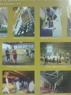館内の仕事をビデオで紹介もしていますがその最初には高砂部屋の十両呼び出し利樹之丞の呼び出しから始まっています。また、各部屋や地域のタニマチ等に明日から本場所を知らせる触れ太鼓の大きな写真にはやはり高砂部屋の十両呼び出し邦夫が太鼓を叩いている写真が飾られています。