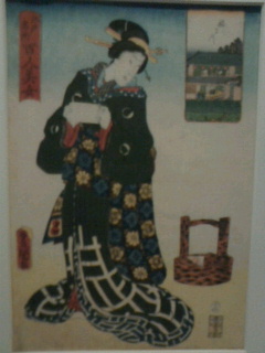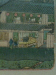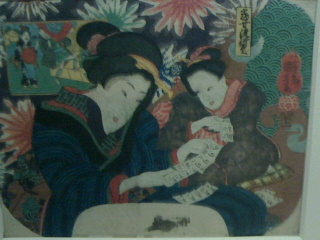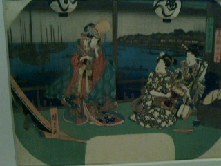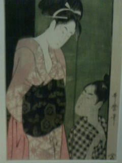 喜多川歌麿の「蚊帳の内外」蚊帳の中の男性、外の女性が描かれていますが蚊帳の彫などは見事です。この作品は重要美術品に指定されています。(ごめんなさい携帯では蚊帳の細かい線が見えないですね。)