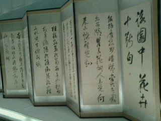 その他に工芸品ではウィーン万博展示品などもありました。他のコーナーではノンベイですから鼈甲の酒器が気になりました。手の込んだ作品です。夏らしい扇、漢字だらけで息苦しくなりそうな屏風です。