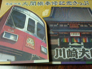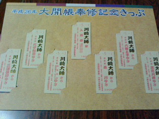 10年に一度の大開帳で期間中赤札(南無阿弥陀仏)祈願をこめて手摺りされた護符を戴ける。京急では全面赤の電車を走らせ達磨のヘッドマークを掲載している。きっぷも川崎大師は金文字で後は赤文字のきっぷを発売。