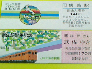 釧路からの乗車券 武佐駅誕生記念乗車券 昭和63年3月13日開業。