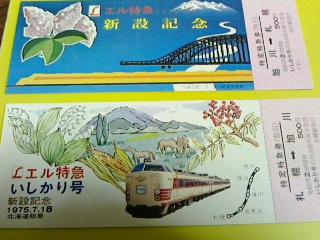 L特急新設記念 旭川―札幌 いしかり特定特急券500円。いしかりは旭川駅から札幌駅まで。L特急は始発駅を時刻丁度に発車します。