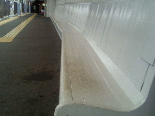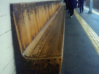 ホーム上に昔は木造のベンチが置かれていました。今は朝夕の混雑などで数は少なく、一人掛け用に肘掛が付いています。ロングシートではマナーの悪い人、酔っぱらいが寝てしまうためでしょうか。