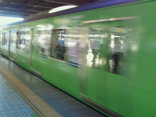 今年の正月から12月までの一年間、山手線はうぐいす色にラッピングして走っています。1編成ですからなかなか見る機会がなく先日は友人と一緒の時偶然ホームに現れました。