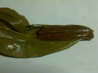 初めて戴きましたが本当の名前は知りません。笹の葉に蒸した餅を包んだ単純なものです。黒糖の味付けで新潟の笹だんごの平らな沖縄版と云ったものでしょうか。