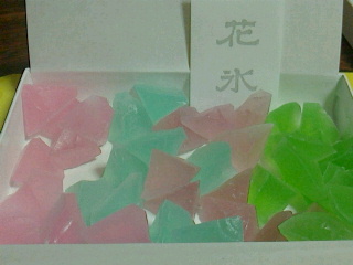 花氷と言うと氷柱の中に花を入れ凍らせたものを言いますが、此方は天草と砂糖で作った外がカリッと中が柔らかいお菓子です。