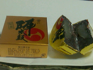 熊本のきんつばで太鼓のようにきれいに包まれていてのこぎりのような切る楊枝も付いています。そのまま食べても、小さく切っても戴けます。