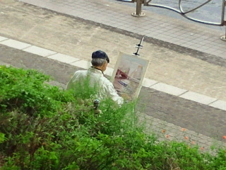 横道にそれたので本来の目的地「すみだ郷土文化資料館」で浮世絵を見せていただき、帰りは隅田川沿いに葉桜の下を散策。川沿いにはアベックが抱き合ったり、多くの日曜画家がスケッチしています。