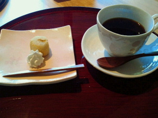 今回からランチでもしっかりした和食風?のコース(櫻膳)も出来、折角ですからそれを戴き、昼間からビールも戴きました。コース最後のデザートとコーヒーは空いていたので喫茶の方で松濤園というお庭を見ながら戴きました。写真のどら焼きは別注文。