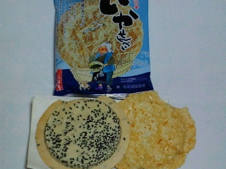 南部せんべいに細かくした裂きイカが乗り黒ゴマとのマッチが最高。おやつにも酒のつまみにも。