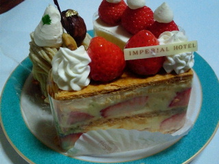 あまりケーキは食べないのですがたまには私のお土産で購入。私はショートケーキと皆でシェアしたアップルパイを戴きました。やはり美味しい。ニューオータニばかりでたまには帝国ホテルやオークラのケーキが食べたいという娘のリクエスト。