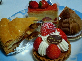 大倉集古館見学の帰りにホテル一階のテラスレストランベーカリーショップで購入。今回は,小さないちごが乗ったフレジェ、モンブラン、タルト、アップルパイをお土産に。