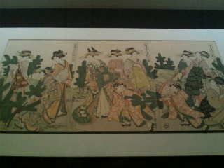 肉筆画は重文の3mを越す池大雅の作品、岩佐又兵衛「本間孫四郎遠矢図」鳥居清長「詠歌弾琴図」、歌麿の美人と若衆図、伝菱川師宣「元禄風俗図」など。
