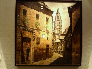 今回の絵ではありませんがロビーには大田区の画家から寄贈された作品を季節ごとに展示しているコーナーがあります。今回はその中から小山洋氏のパリの街角、トレドの昼下がり。