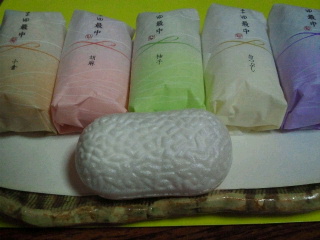 まゆの形をした5種類の色が違った小さい一口サイズの最中。小倉、ごま、白つぶし(白インゲン豆)、ゆず、黒糖の5色。