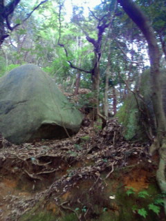 下に降りたら昔、舗装された道へ出てどっちへ行って良いのか解らないですが取り敢えず右に行く。上からは大きな石が木で一応止まっていますが一寸した揺れで落ちてくる心配があります。