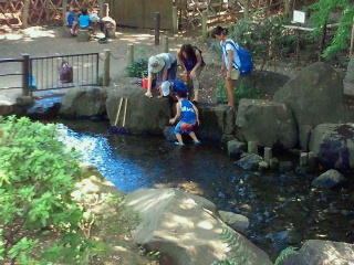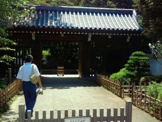薬医門、回遊式の庭園があり池では子供たちが水遊びを、大人は木々の下で涼んでいます。