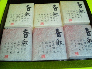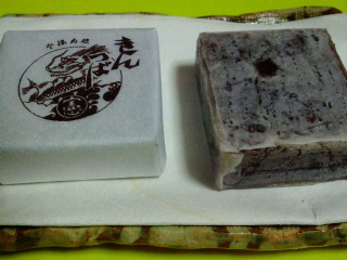 島根の松江のお菓子で同じ松江の桂月堂の薄小倉と同じような水あめと砂糖・寒天で固めたお菓子で赤が小豆、黄色がゆずとなっています。同じような商品は金沢、京都、大垣、松江など御茶の盛んな地にあります。