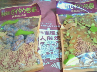 今回はゼイタク煎餅の中でも好きなそら豆が入ったビンズとゆかりがまぶされている山海を人形町でなく武蔵小山商店街内の分店で購入。本来のせんべいではないですが紅梅焼や瓦煎餅も好きです。
