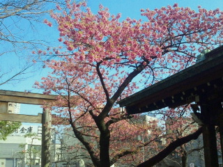 京急青物横丁駅近くの目黒川沿いの荏原神社。南の天王様と呼ばれ品川宿の総鎮守社。本堂正面に2月終わりから1ヶ月近く咲いています。これはタイワンヒザクラ(別名寒緋桜)と呼ばれているようです。赤い花が下向きに咲いています。沖縄の桜はこの寒緋桜。この桜とオオシマサクラの自然交配で生まれたのが河津桜。