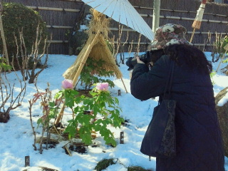 此処はカメラを持った人がシャッターチャンスを狙い多くの人がいます。日本庭園の池をぐるっと廻る脇に1000株が植えられているそうです。もう咲ききった株、これからの大きな蕾をつけたもの、そして上には雪よけのわらのコモ、傘などがかけてあります。