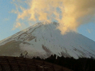 目指す温泉は不便なところにありますから地元の人中心で、バスに乗らず自分の車で来ているようです。早速、500円を払いいざ露天風呂へ。ところが、沼津でも車中でもあんなに綺麗に雲ひとつなかった富士山に雲が掛かっています。誰か、ふうっとあの雲を吹いて飛ばしてくれ。(富士山の雲は帰りのバス停からですが浴槽からもこのような雲が)