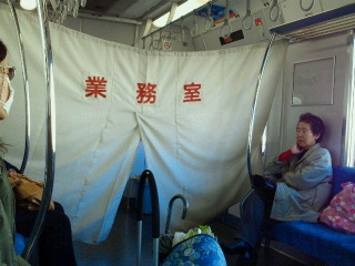 車窓からは大きな富士山が沿って見えます。雲ひとつなく最高の大きな富士山です。途中乗り込んできたお客は富士山には目もくれず、富士山だと騒いでいるのは我々だけ。もう毎日見慣れているので富士山が大きく見えるのは当たり前のようです。車内後方にはカーテンで仕切り業務室として、荷物を運んでいます。
