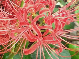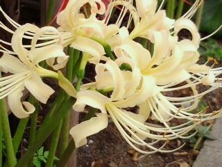 今日は咲いていました。また彼岸花もやっと咲き始めました。群生でなくたった3本です。毎年そのままほっぽりぱ無しですが固まりは大きいのですが2本だったり5本だったりとその年によって違います。また種が飛んだのか(確か球根なんだが)違う鉢からも上がってきました。