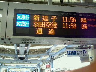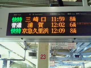 写真の運行版ですが羽田からエアーポート急行新逗子行きが先に来ます。京急蒲田発11:56、その3分後に隣のホームに三崎口行き快特が入ります。急行、快特は京急川崎が停車駅です。