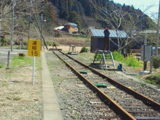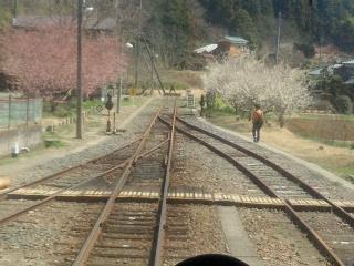 先週の小湊、いすみと比べれば全く逆で平日でもありタブレット交換もなくなり乗車は少なく、車内はガラガラです。それでも撮り鉄らしき人が何人かいます。また車窓からはいすみ線のような菜の花も咲いてなく地元の応援団もいないようです。