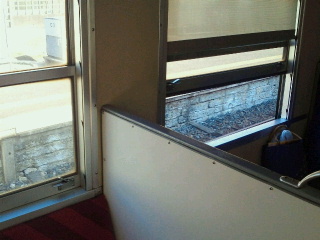 先頭車では撮り鉄が一生懸命見ていたり写真を取ったりしています。しかし途中からカーテンを降ろされてしまいました。その窓ガラスも余り拭き掃除をしていない状態です。私鉄ならそんな事がないでしょうがまだJRはお役所なんでしょうか。