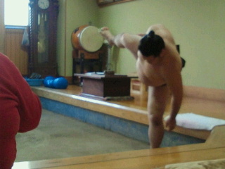 昔の厳しい稽古からかなりやさしくなっているようです。朝赤龍は廻しを付けて土俵に降りていますが柔軟体操程度でゴムで軽いトレーニングでした。若者頭、松田さんが指導をしています。親方はたまにちょっとこいと言って一言程度のアドバイスです。