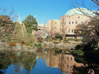 潮入式回遊大名庭園、,安田善次郎氏寄贈の旧安田庭園現在は墨田区の管理。雪つりの方が高い?右はお土産ののし餅、番付で作った楊枝入れがかわいい。此れも女性の心遣い。つくづく女性パワーを感じた一日でした。やはり濡れ落ち葉でいよう。