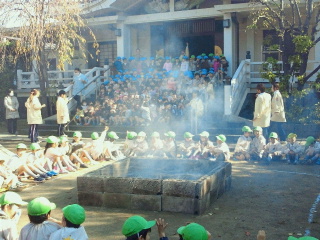 園児が先生と共に焼き芋の歌や冬の童謡など歌いながら芋が焼けるのを楽しみに待っています。囲いの中に芋が入っていますが今は落ち葉でなく紙や木材のようです。そして灰が舞い上がらないように金網が掛かっています。