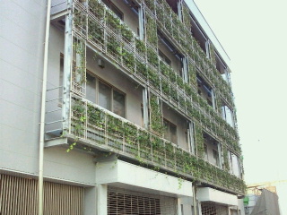 左は工事中の建物です。今は建設面積によって緑地を設けないといけないようで壁に緑地を設けた変わった建物です。後から蔦などを絡ませるのはありますが建設中から絡ませています。