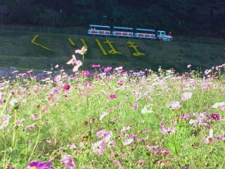 入場は無料で山の斜面ですから有料の機関車型バスが走っています。中には足湯、アスレチック、パークゴルフ、ハーブ園、全国の県木などがあります。