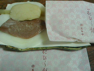 とらやの正月のお菓子、花ひら餅は宮中で戴く雑煮は円くした菱はなびら餅に牛蒡と白みそを挟んで二つに折った餅が行事食だそうでそれを味噌あんと牛蒡を挟んだ正月餅菓子にしたそうです。
