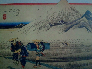 14枚目原、画面から大きい富士が飛び出す原ですが荷物を持つ伴の着物には広重の名前をカタカナで描いた「ヒロ」が見られます。広重は他の東海道物でも原の富士山は画面から飛び出す絵になっています。富士山がそんなに大きく見られるのかと原で下車した事がありますが今はそんなに大きく見えなかった記憶があります。