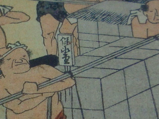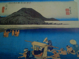 20枚目府中、家康の駿府城がある府中です。このシリーズ唯一の東海道五拾三次の内のタイトルが上段に横書きの図です。安倍川を渡る図ですが右下の肩車で渡る旅人の法被に版元の竹内の竹が描かれています。
