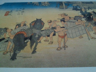 23枚目藤枝では問屋場での情景ですが馬の腹掛けにこのシリーズの版元竹内、荷物には保永堂と描かれています。