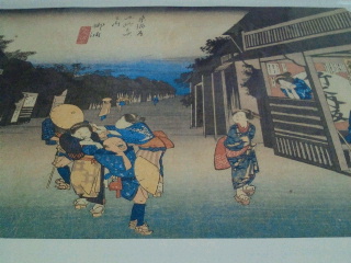 さりげなく版元や自身の名前、彫師、摺師、化粧品の宣伝などをいれています。そんな事を気にしながら細部もよく見ることになります。これも一つの楽しみでもあります。また東海道には沢山のお城があったのですが私には6つしか気が付かない。