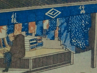 41枚目の鳴海名物有松絞ですがその絞りを販売しているお店ののれんに広重のヒロを組み合わせた印、版元の竹内、新版が描かれています。