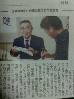 読売朝刊に何処かで見た人が、良く見ると日本書鏡院の長谷川先生でした。月3回、衆議院宿舎で朝6時から与野党の国会議員に書を教えているようです。