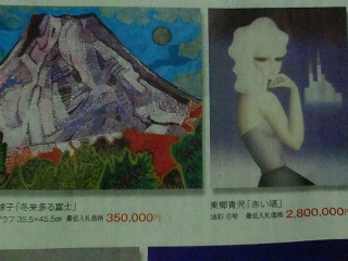左側が片岡球子「冬来多る富士」複製版画、リトグラフ35.5Cm×45.5Cmが35万円。右は東郷青児「赤い塔」油彩 280万円。