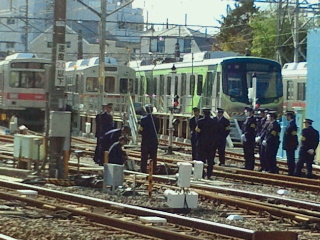 駅の近くには検車区があり、電車、工事車両などが止まっています。電車の制服を着た人達が研修をしています。この線路を使い電車の折り返しなどをするようです。