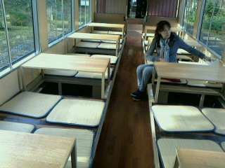 会津鉄道のトロッコ列車先頭車木のテーブル、座席、後ろがお座敷、最後部が展望車になっている。
