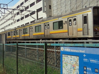新丸子駅は高架で保線車両も高架に待機していて残念ながら下から見られません。駅到着近くで車窓からになります。