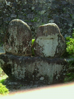 塀として囲っていた多分天守の瓦を使った塀も崩れています。その神社裏には大きな石がたくさん積まれています。そこも何とか乗り越えここから先へ降りようとチャレンジ。