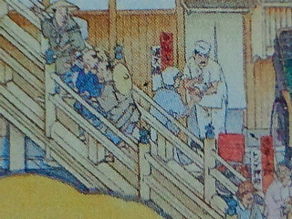 洛中洛外図ですが良くみると木製のエスカレーター、大きい画面の下中央には車など現代が写しこまれています。この一枚の絵で暫くは宝探し状態、このような絵が沢山展示しています。さて本来の作者の意図は?