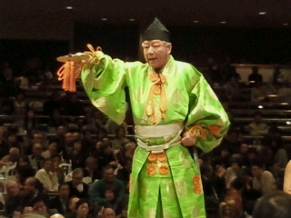 そして着物の素晴らしさが行司さんです。行司さんも格によって装束が違います。ご存知のように木村庄之助は紫房、足袋、草履、短刀、印籠を装束として、今は不在ですが式守伊之助も立行司として紫白房、足袋、草履、短刀、印籠を許されています。左は昨日、隣が2日目の木村庄之助の装束です。